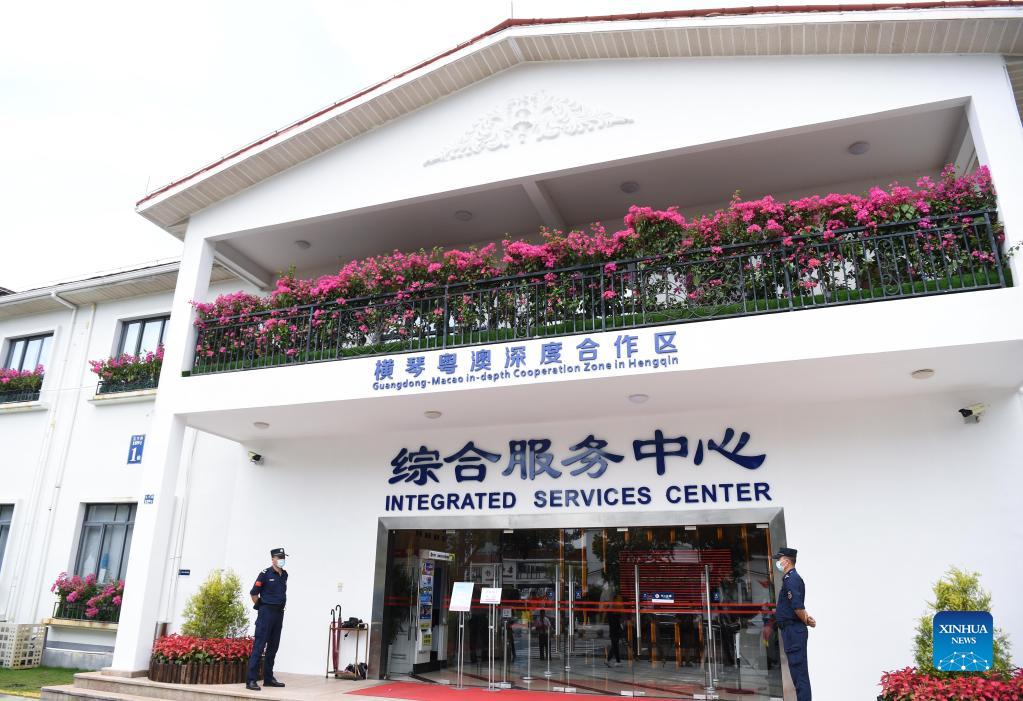 Photo taken on Sept. 17, 2021 shows the integrated services center of Guangdong-Macao In-depth Cooperation Zone in Hengqin, in Zhuhai City, south China's Guangdong Province. Administrative organizations of the Guangdong-Macao In-depth Cooperation Zone in Hengqin were inaugurated on Friday. On Sept. 5, China's central authorities issued a general plan for building a Guangdong-Macao in-depth cooperation zone in Hengqin, which is located in the southern part of Zhuhai City in Guangdong Province, just across the Macao Special Administrative Region. (Xinhua/Deng Hua)