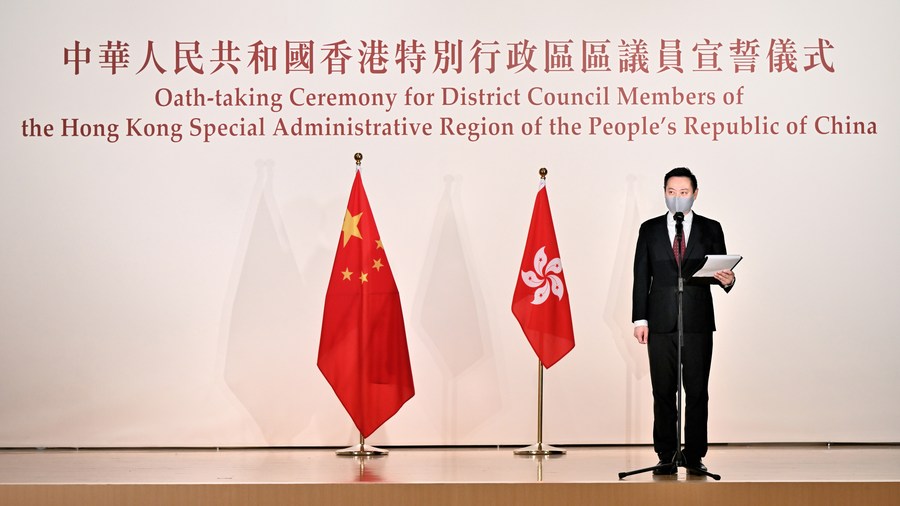 The spokesperson stressed that the HKSAR government's implementation of the oath-taking arrangement for district council members will help district councils to focus on improving the livelihood of people in the communities, crack down on anti-China, destabilizing forces in Hong Kong who use the councils to squander public funds and engage in political mutual-destruction, and protect various lawful rights and freedoms of Hong Kong residents.