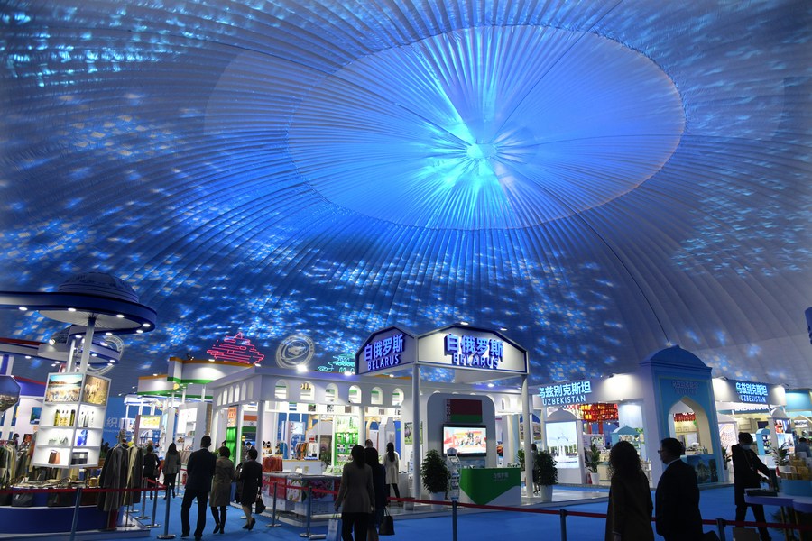 People visit the 2021 Shanghai Cooperation Organization (SCO) International Investment and Trade Expo in Qingdao, east China's Shandong Province, April 26, 2021. (Xinhua/Li Ziheng)