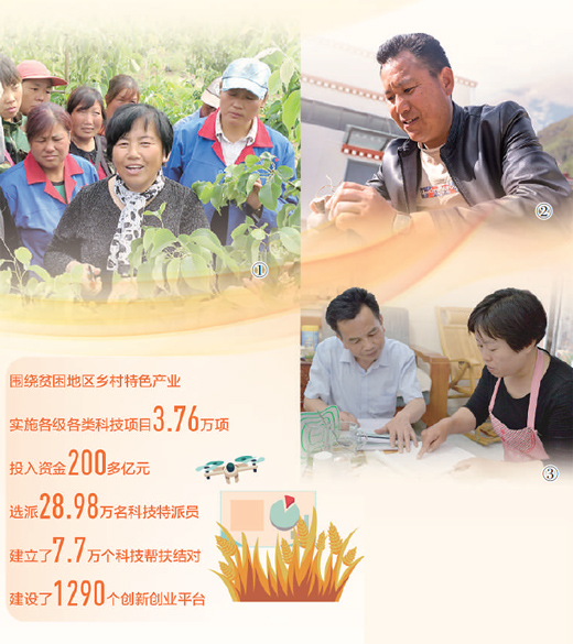 Photo ① shows Guo Huangping (C) introducing new technology to fruit growers. (Photo/People's Daily) Photo ② shows a technician inspecting the progress in growing some medicinal materials. (Photo/People's Daily) Photo ③ shows Zhou Quanshui (L) providing assistance to a farmer. (Photo/People's Daily)