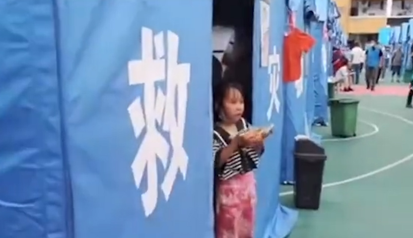 Two days after an magnitude 6.0 earthquake, victims at temporary shelters in Luxian County, Sichuan Province were provided with hot meals, which consist of two meat dishes and one vegetable dish.