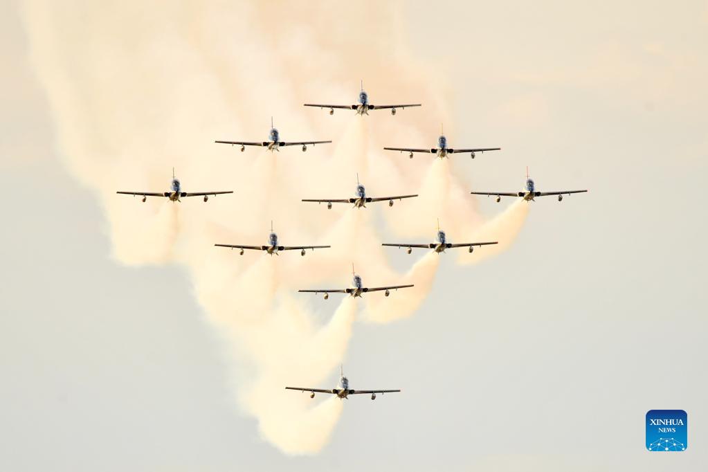 The Italian Frecce Tricolori aerobatic squad performs during an airshow in Rivolto, Italy, on Sept. 18, 2021. The Italian Air Force held the airshow to mark the 60th anniversary of the Frecce Tricolori here on Saturday. (Str/Xinhua)