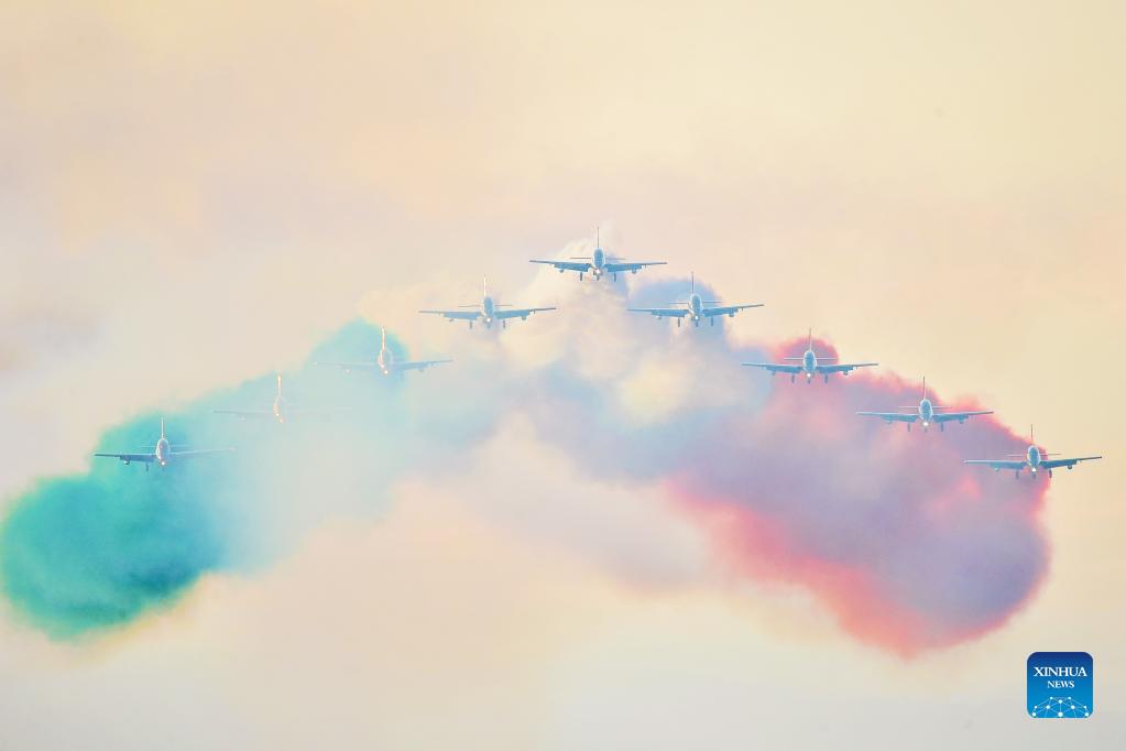 The Italian Frecce Tricolori aerobatic squad performs during an airshow in Rivolto, Italy, on Sept. 18, 2021. The Italian Air Force held the airshow to mark the 60th anniversary of the Frecce Tricolori here on Saturday. (Str/Xinhua)