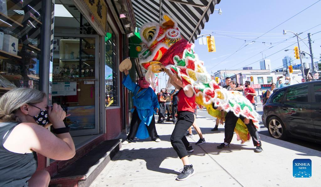 People perform a lion dance at the Chinatown in Toronto, Canada, on Sept. 18, 2021. A traditional lion dance parade was held here on Saturday to celebrate the upcoming Mid-Autumn Festival. (Photo by Zou Zheng/Xinhua)