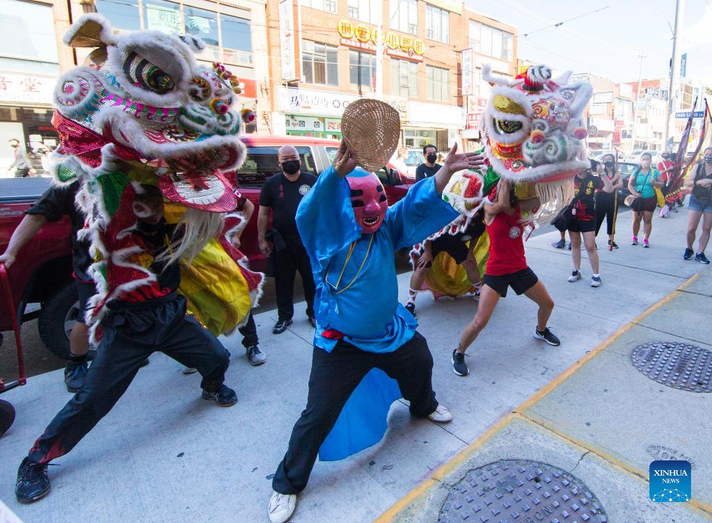 People perform a lion dance at the Chinatown in Toronto, Canada, on Sept. 18, 2021. A traditional lion dance parade was held here on Saturday to celebrate the upcoming Mid-Autumn Festival. (Photo by Zou Zheng/Xinhua)