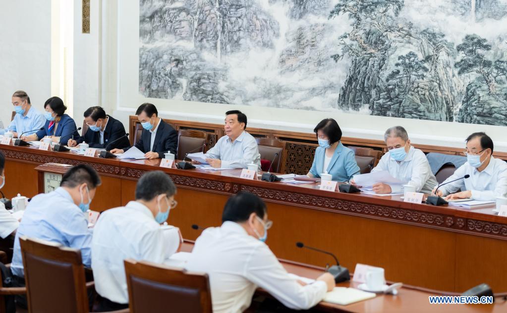 Wang Chen, a member of the Political Bureau of the Communist Party of China Central Committee and vice chairman of the National People's Congress Standing Committee, speaks at the second plenary meeting of the teams of lawmakers to inspect the enforcement of the Law on Prevention and Control of Environmental Pollution by Solid Waste in Beijing, capital of China, Sept. 18, 2021. (Xinhua/Zhai Jianlan)
