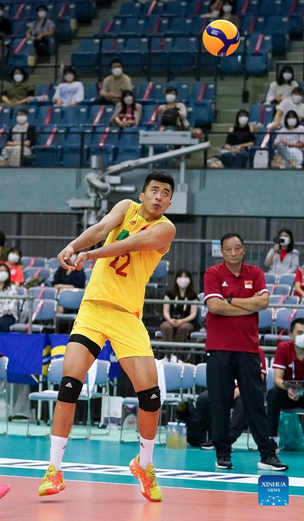 Zhang Jingyin (L) of China competes during the semi-final against Iran at the 21st Asian Senior Men's Volleyball Championship in Chiba, Japan on Sept. 18, 2021. (Photo by Christopher Jue/Xinhua)