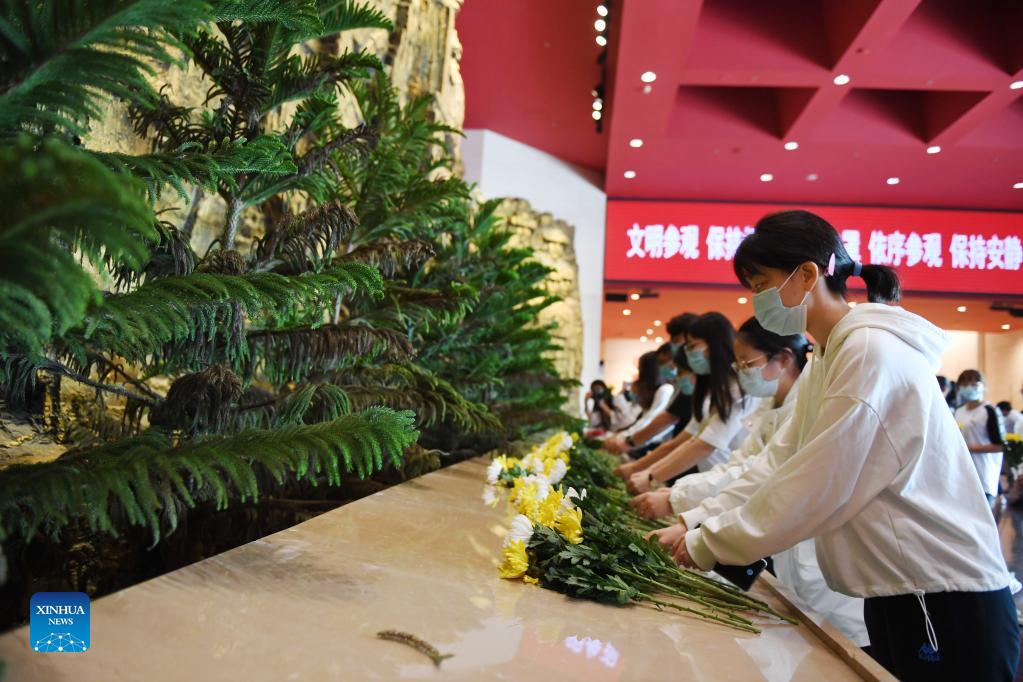 Visitors present flowers to pay tribute to revolutionary martyrs at the Museum of the War of Chinese People's Resistance Against Japanese Aggression in Beijing, capital of China, Sept. 18, 2021. Various activities are held on Sept. 18 in commemoration of the September 18 Incident 90 years ago that marked the start of Japan's 14-year invasion of China. (Xinhua/Zhang Chenlin)
