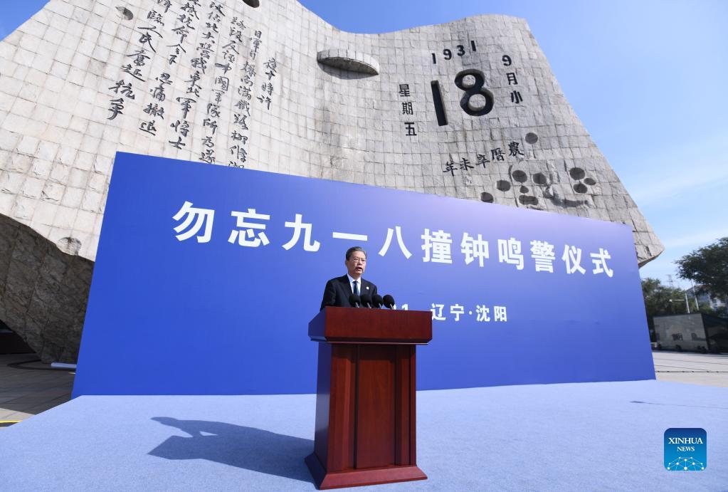 Zhao Leji, a member of the Standing Committee of the Political Bureau of the Communist Party of China (CPC) Central Committee and secretary of the CPC Central Commission for Discipline Inspection, speaks at a bell-tolling ceremony marking the 90th anniversary of the September 18 Incident, at the September 18 Incident History Museum in Shenyang, northeast China's Liaoning Province, Sept. 18, 2021. (Xinhua/Zhang Ling)