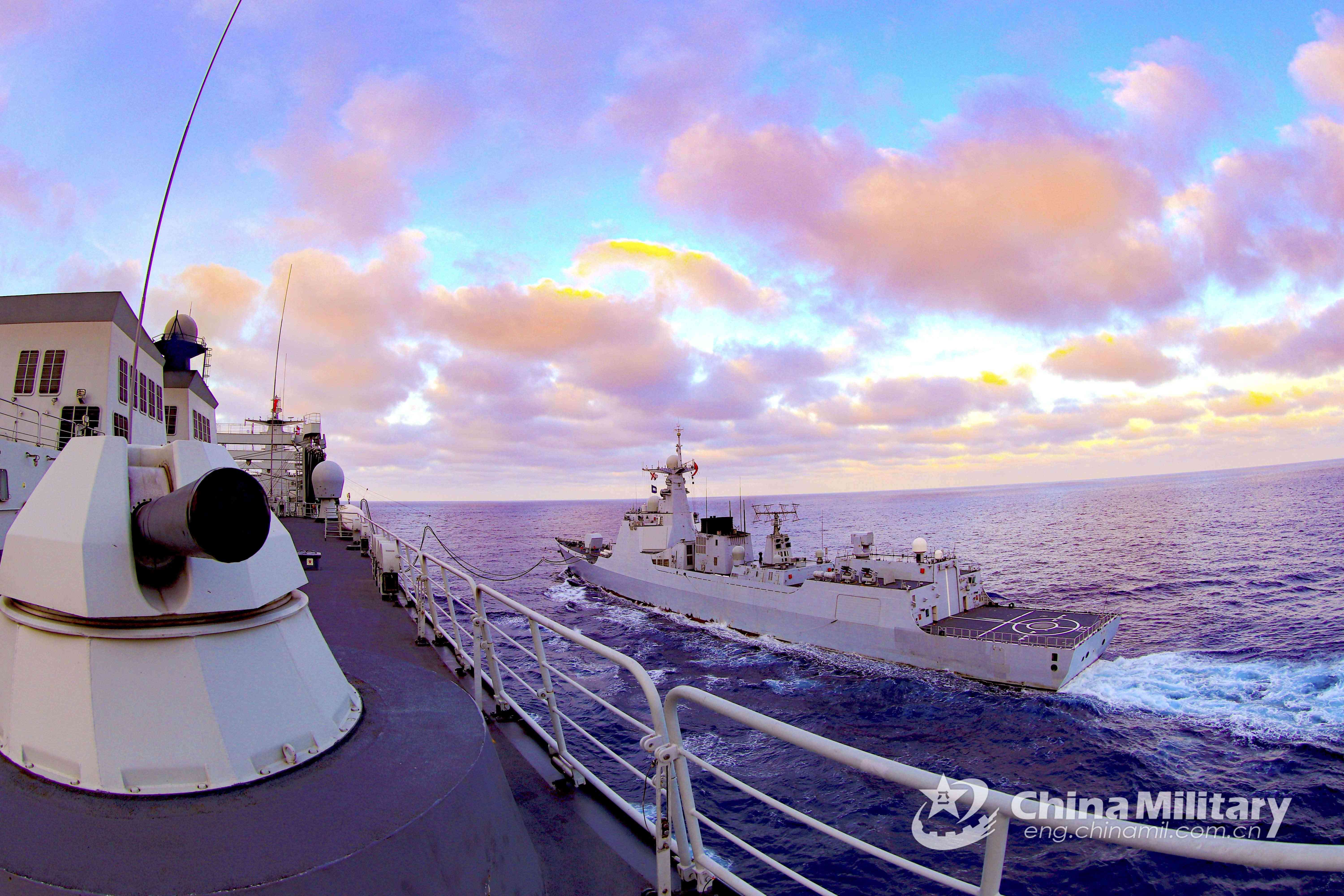 The comprehensive supply ship Weishanhui (Hull 887) provides supplies to the guided-missile destroyer Yinchuan (Hull 175) during an alongside replenishment-at-sea drill in waters of the South China Sea on August 20, 2021. They are attached to a naval flotilla under the PLA Southern Theater Command. (eng.chinamil.com.cn/Photo by Li Junlin)