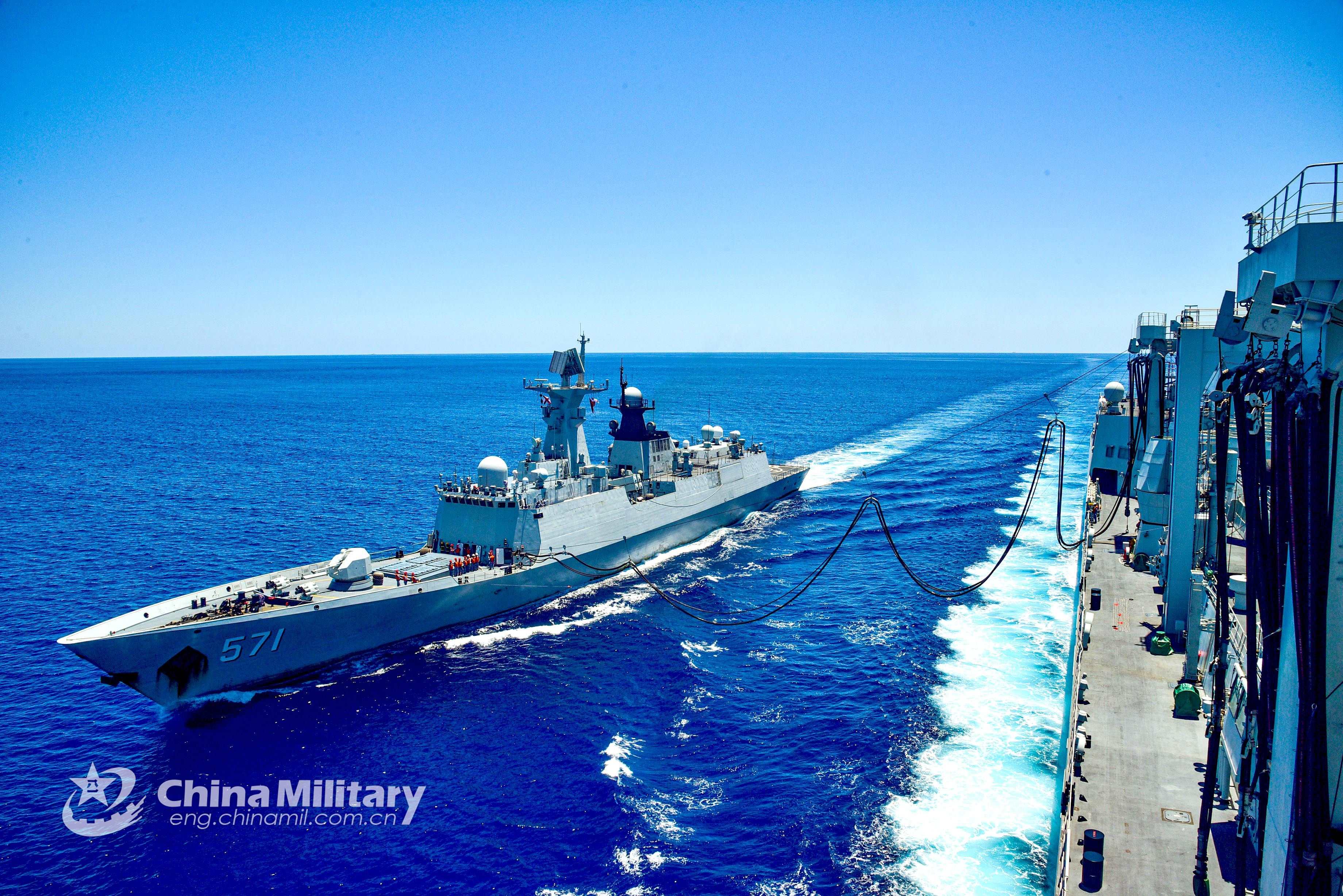 The comprehensive supply ship Weishanhui (Hull 887) provides supplies to the guided-missile frigate Yuncheng (Hull 571) during an alongside replenishment-at-sea drill in waters of the South China Sea on August 20, 2021. They are attached to a naval flotilla under the PLA Southern Theater Command. (eng.chinamil.com.cn/Photo by Li Junlin)