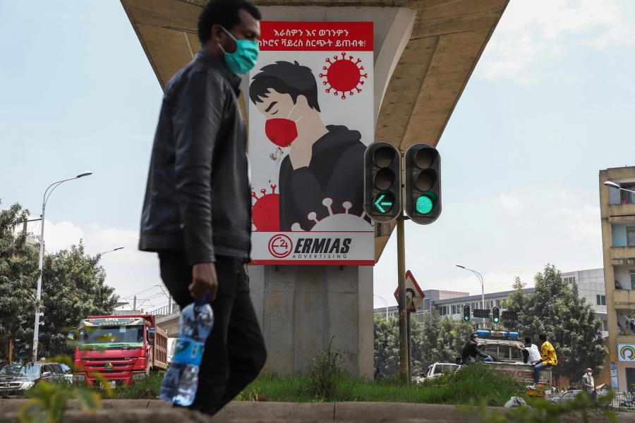 A pedestrian wearing a face mask walks beside a billboard warning about the dangers of COVID-19 in Addis Ababa, capital of Ethiopia, August 21, 2020. (Xinhua/Michael Tewelde)