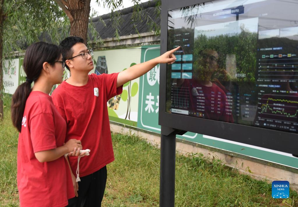Bai Jie (L) and Shao Qi, college students from China Agricultural University, check data on a screen in Future Orchard in Xiying Village of Yukou Township in Pinggu District of Beijing, capital of China, Sept. 19, 2021. "Future Orchard" is a high-tech orchard founded by local government with China Agricultural University and other enterprises. The orchard has a lab and four hectares of land with peach and kiwi trees. With the help of intelligent monitoring system for data analysis, accurate management and visual diagnosis on the environment of fruit trees, the orchard realizes improvement of planting efficiency, fruit yield and quality. (Xinhua/Ren Chao)