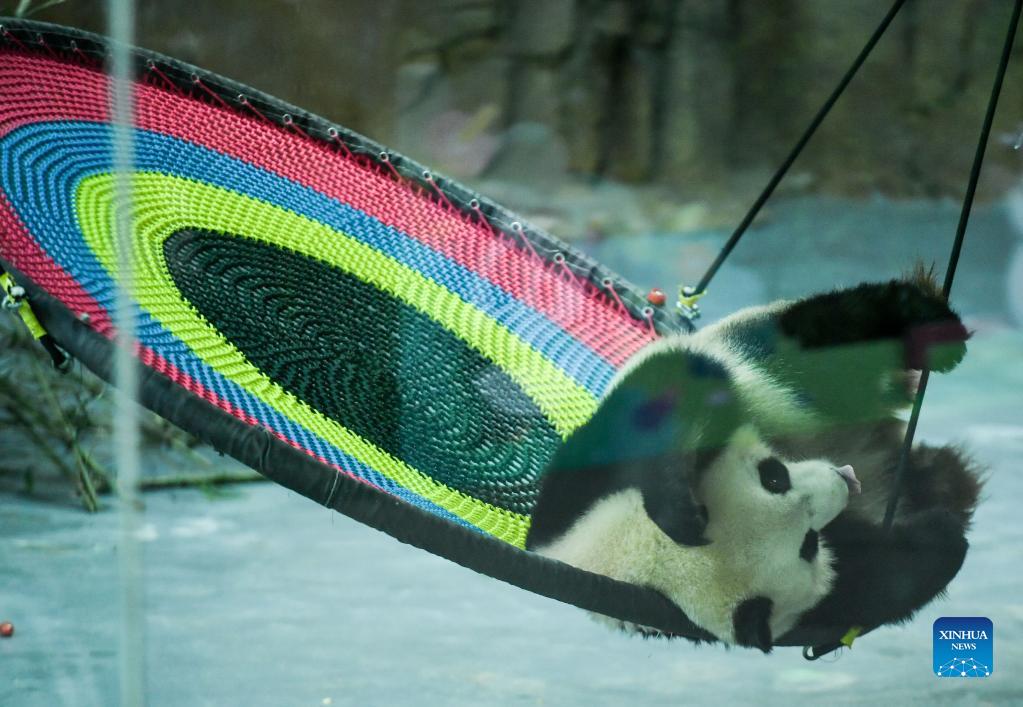 Giant Panda "Qi Guo" plays at the panda house of Xining Wildlife Park in Xining, northwest China's Qinghai Province, Sept. 19, 2021. Tourists visited the panda house on Sunday, the first day of the 3-day Mid-Autumn Festival holiday. (Xinhua/Xue Yubin)