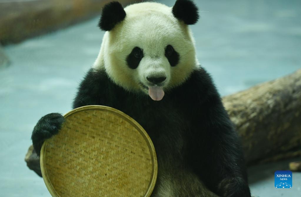 Giant Panda "Qi Guo" plays at the panda house of Xining Wildlife Park in Xining, northwest China's Qinghai Province, Sept. 19, 2021. Tourists visited the panda house on Sunday, the first day of the 3-day Mid-Autumn Festival holiday. (Xinhua/Xue Yubin)