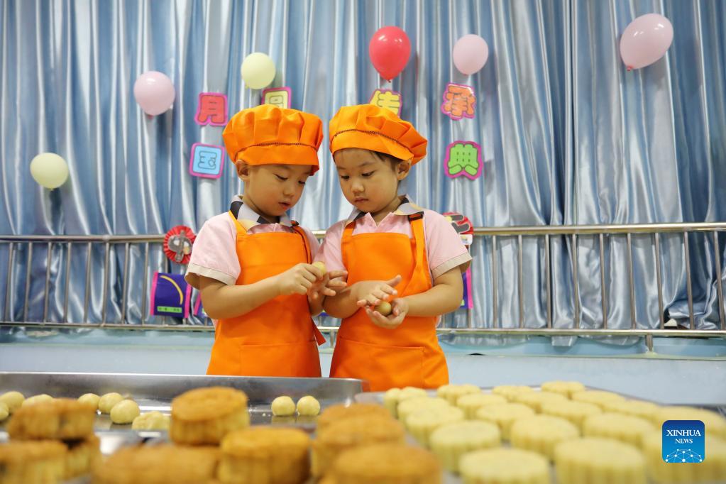 Children learn to make mooncakes at a kindergarten in Lincheng County of Xingtai, north China's Hebei Province, Sept. 19, 2021. The kindergarten held a folk culture activity on Sunday to greet the upcoming Mid-Autumn Festival that falls on Sept. 21. (Xinhua/Luo Xuefeng)
