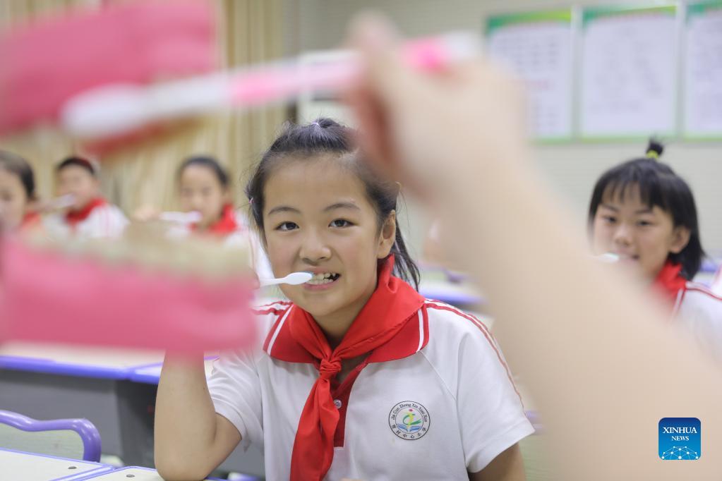 Students learn the right way to brush teeth at a school in Lincheng County of Xingtai City, north China's Hebei Province, Sept. 18, 2021. China's Dental Care Day falls on Sept. 20. (Xinhua/Luo Xuefeng)