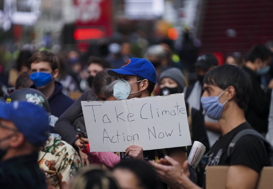 People take part in a climate change protest in Times Square in New York, the United States, on Sept. 20, 2020. (Xinhua/Wang Ying)