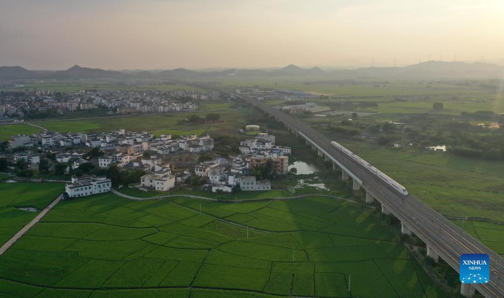 Aerial photo taken on Sept. 19, 2021 shows a bullet train running above paddy fields in Gula Township, Binyang County, south China's Guangxi Zhuang Autonomous Region. (Xinhua/Huang Xiaobang)
