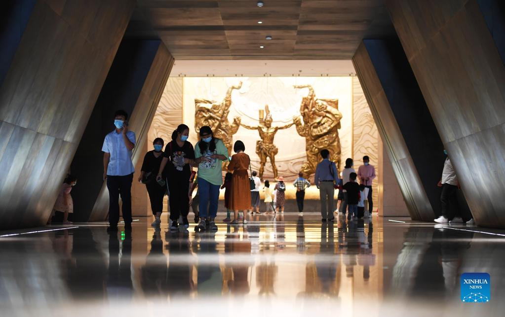People visit Henan Museum in Zhengzhou, central China's Henan Province, Sept. 20, 2021. Many people visited the museum during the Mid-Autumn Festival holiday. (Xinhua/Zhang Haoran)