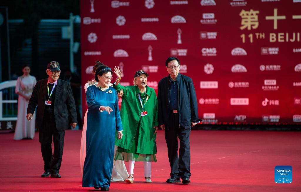 Artists Wang Xiaotang (front) and Xie Fang (2nd R) walk on the red carpet for the 11th Beijing International Film Festival in Beijing, capital of China, Sept. 20, 2021. (Xinhua/Chen Zhonghao)