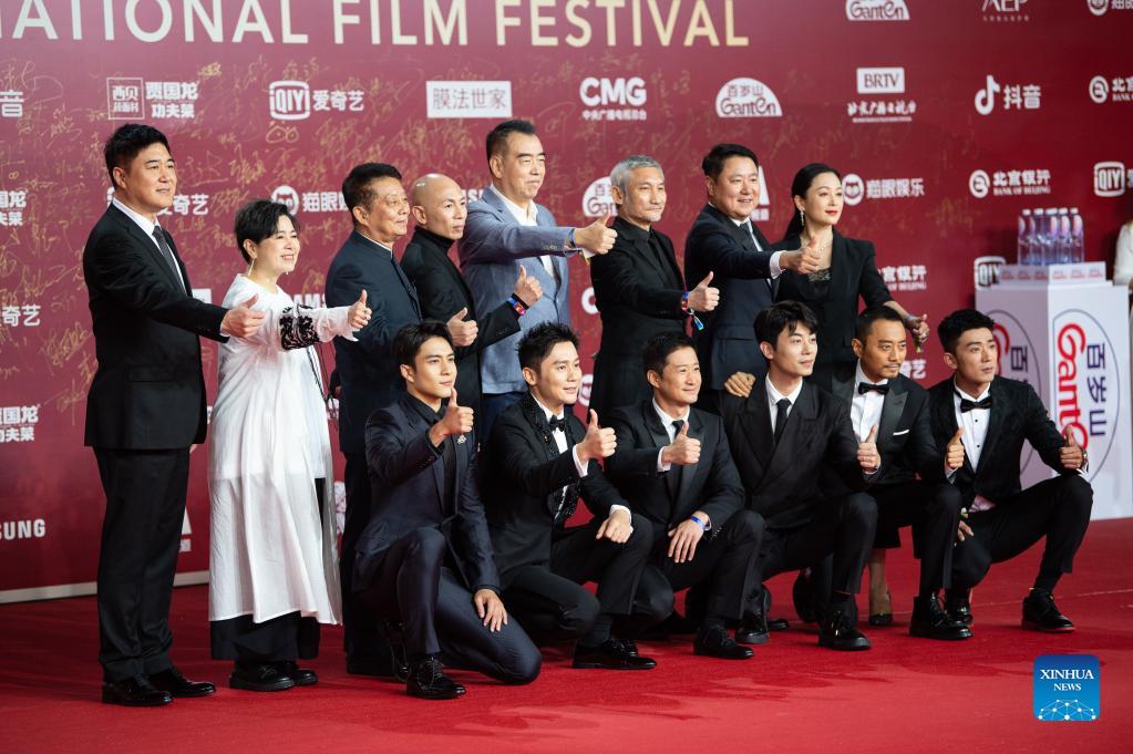 Cast members of the film the Battle at Lake Changjin pose for a group photo on the red carpet for the 11th Beijing International Film Festival in Beijing, capital of China, Sept. 20, 2021. (Xinhua/Chen Zhonghao)