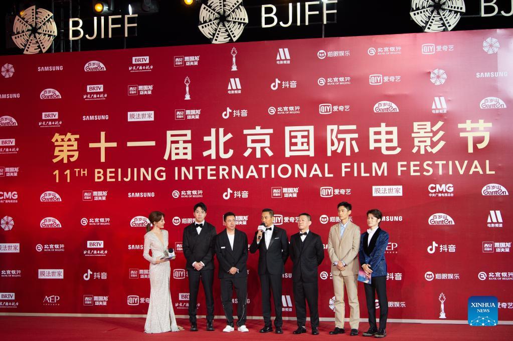 Cast members of the film Railway Heroes receive an interview on the red carpet for the 11th Beijing International Film Festival in Beijing, capital of China, Sept. 20, 2021. (Xinhua/Chen Zhonghao)