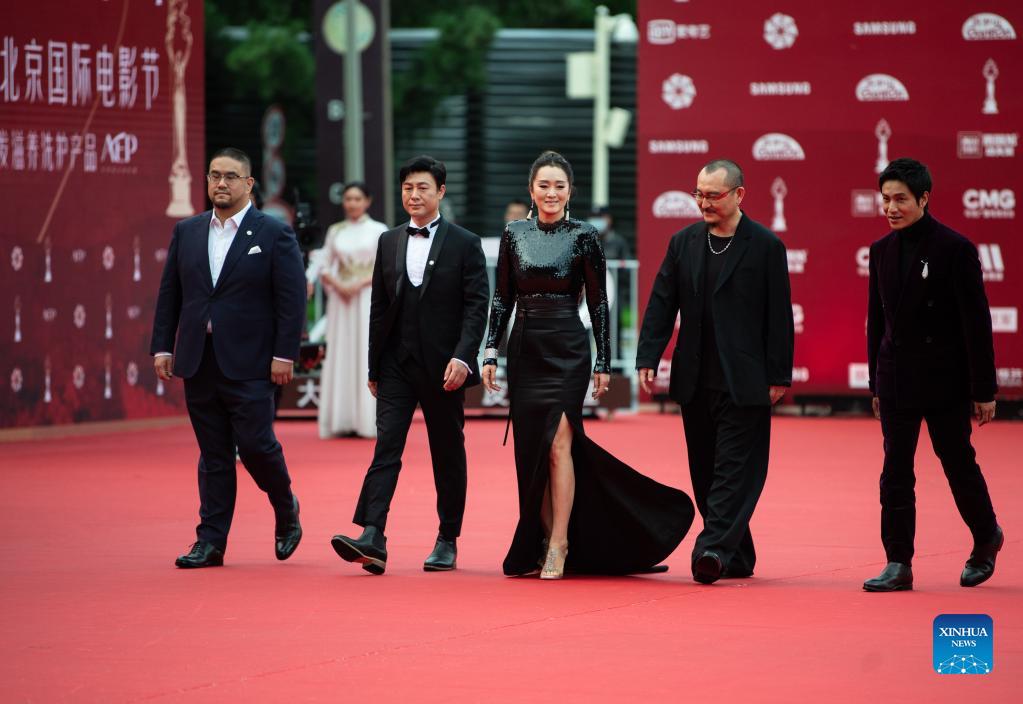 Jury members of the Tiantan Awards Gong Li (C), Chen Kun (1st R), Chen Zhengdao (1st L), Wuershan (2nd R) and Zhang Songwen walk on the red carpet for the 11th Beijing International Film Festival in Beijing, capital of China, Sept. 20, 2021. (Xinhua/Chen Zhonghao)