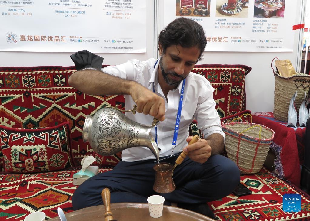 Exhibitor Osan demonstrates how to make Turkish sand coffee on a stove at the 18th China-ASEAN Expo held in Nanning, capital of south China's Guangxi Zhuang Autonomous Region, Sept. 11, 2021. (Xinhua/Zhu Lili)