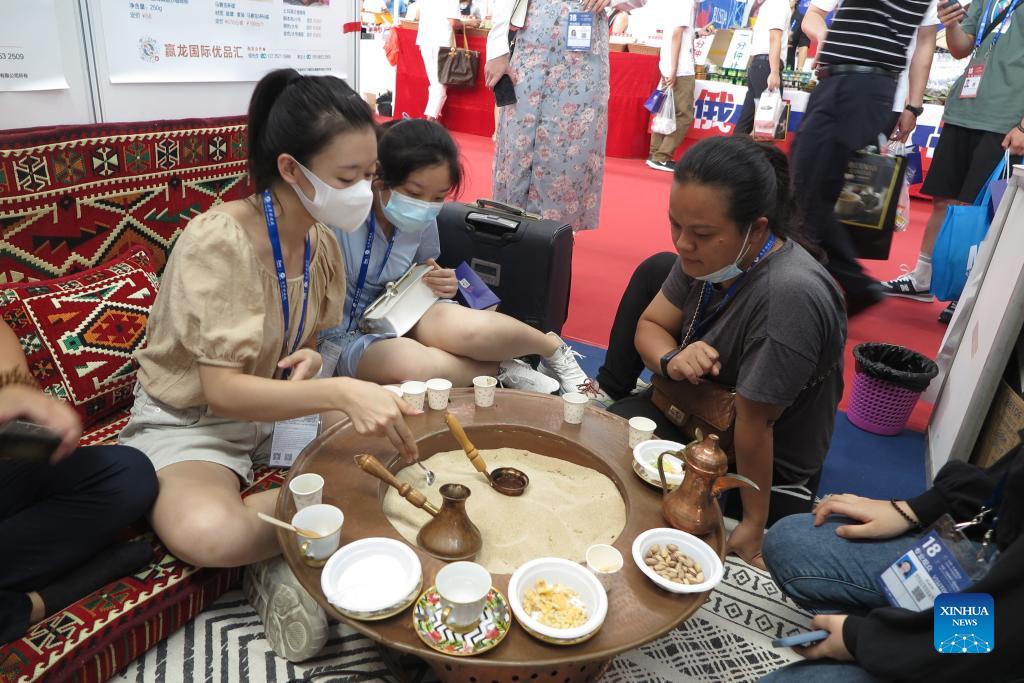 A visitor tries making Turkish sand-brewed coffee at the 18th China-ASEAN Expo held in Nanning, capital of south China's Guangxi Zhuang Autonomous Region, Sept. 11, 2021. (Xinhua/Zhu Lili)