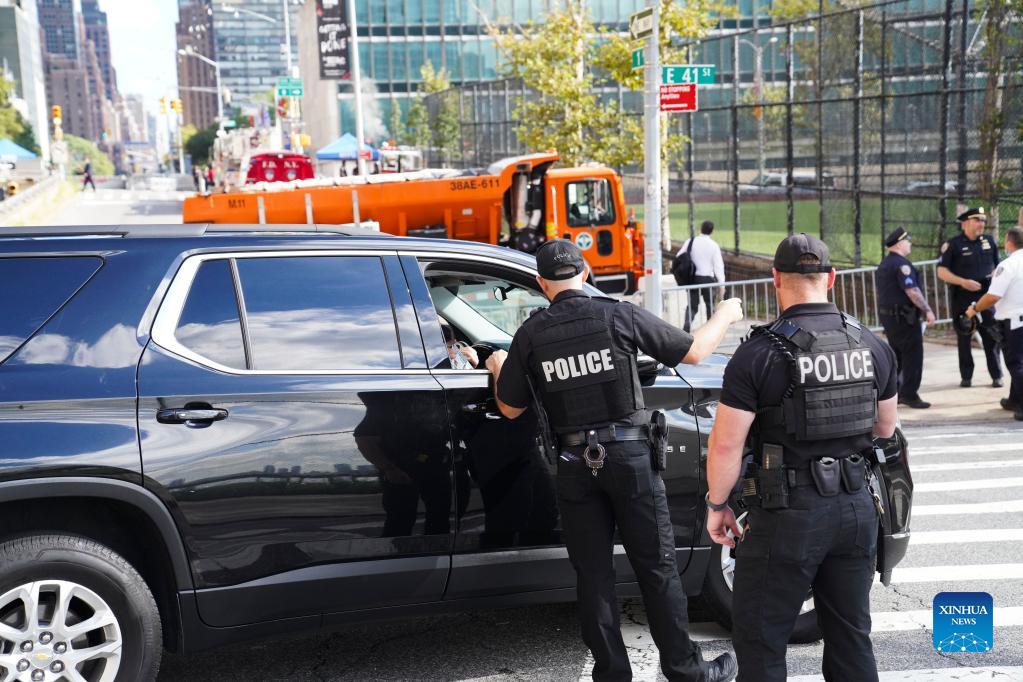 Police check a vehicle on a street near the UN headquarters in New York, Sept. 20, 2021. The General Debate of the 76th session of the United Nations General Assembly will kick off on Sept. 21. (Xinhua/Wang Ying)