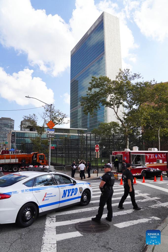 Police stand guard on a street near the UN headquarters in New York, Sept. 20, 2021. The General Debate of the 76th session of the United Nations General Assembly will kick off on Sept. 21. (Xinhua/Wang Ying)