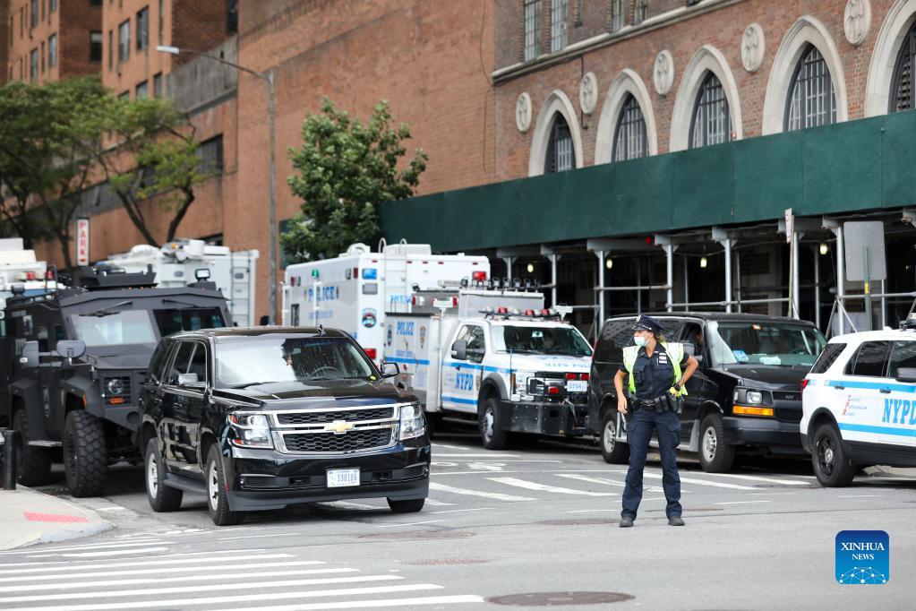 A police officer stands guard on a street near the UN headquarters in New York, Sept. 20, 2021. The General Debate of the 76th session of the United Nations General Assembly will kick off on Sept. 21. (Xinhua/Wang Ying)