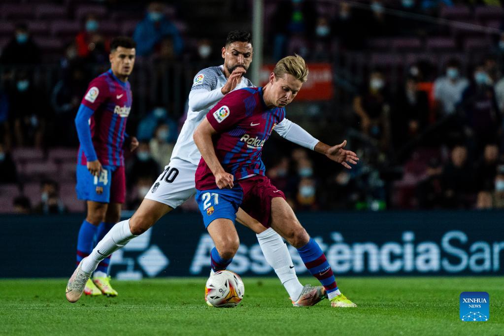 Barcelona's Frenkie de Jong (R) vies with Granada's Antonio Puertas during a Spanish first division league football match between FC Barcelona and Granada CF in Barcelona, Spain, on Sept. 20, 2021. (Photo by Joan Gosa/Xinhua)