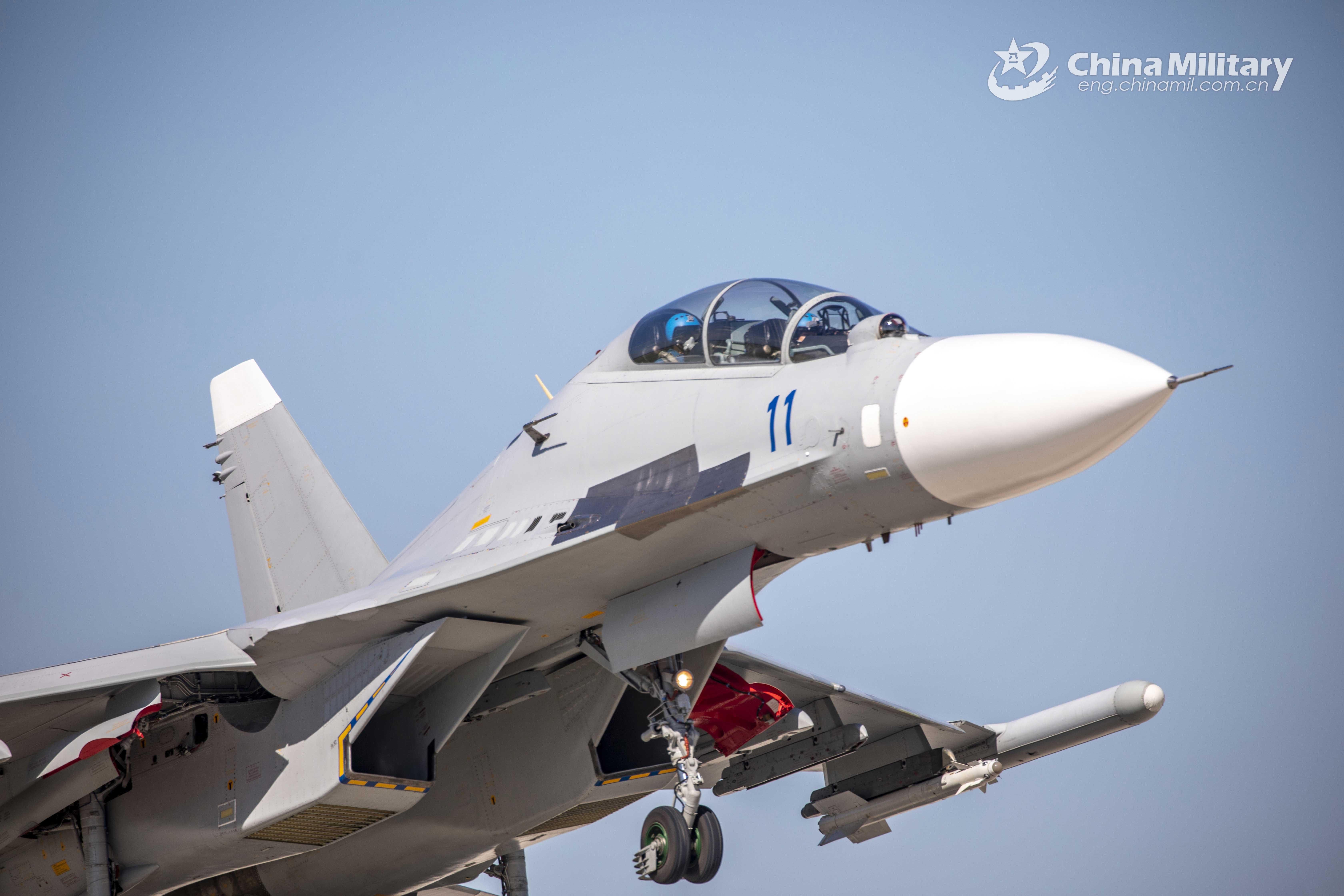 A fighter jet attached to an aviation brigade under the PLA Navy roars into the sky during a round-the-clock live-fire training exercise in late August, 2021. (eng.chinamil.com.cn/Photo by Tian Jianmin)