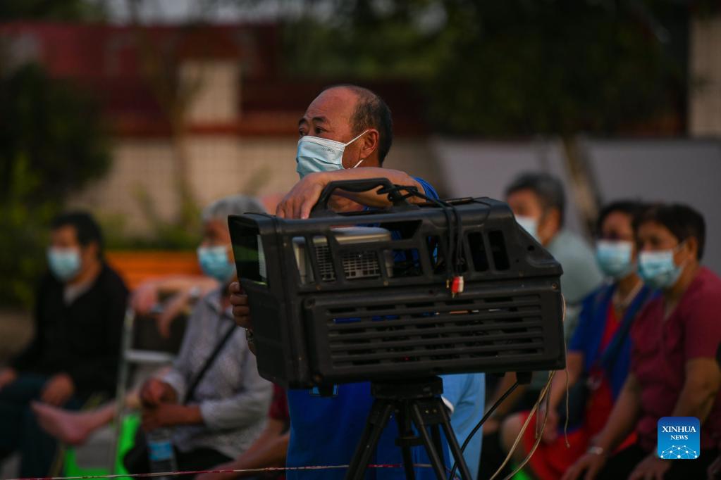A staff member adjusts a film projector at a nursing home in Fuji Township of Luxian County, southwest China's Sichuan Province, Sept. 21, 2021. Residents from Sichuan Province who were affected by an earthquake that struck on Sept. 16 began returning home on Monday morning, as the local work priority has been shifted from emergency rescue to post-quake reconstruction. A 6.0-magnitude earthquake jolted Luxian County in the city of Luzhou at 4:33 a.m. on Sept. 16, leaving three people dead and 146 injured. (Xinhua/Xu Bingjie)
