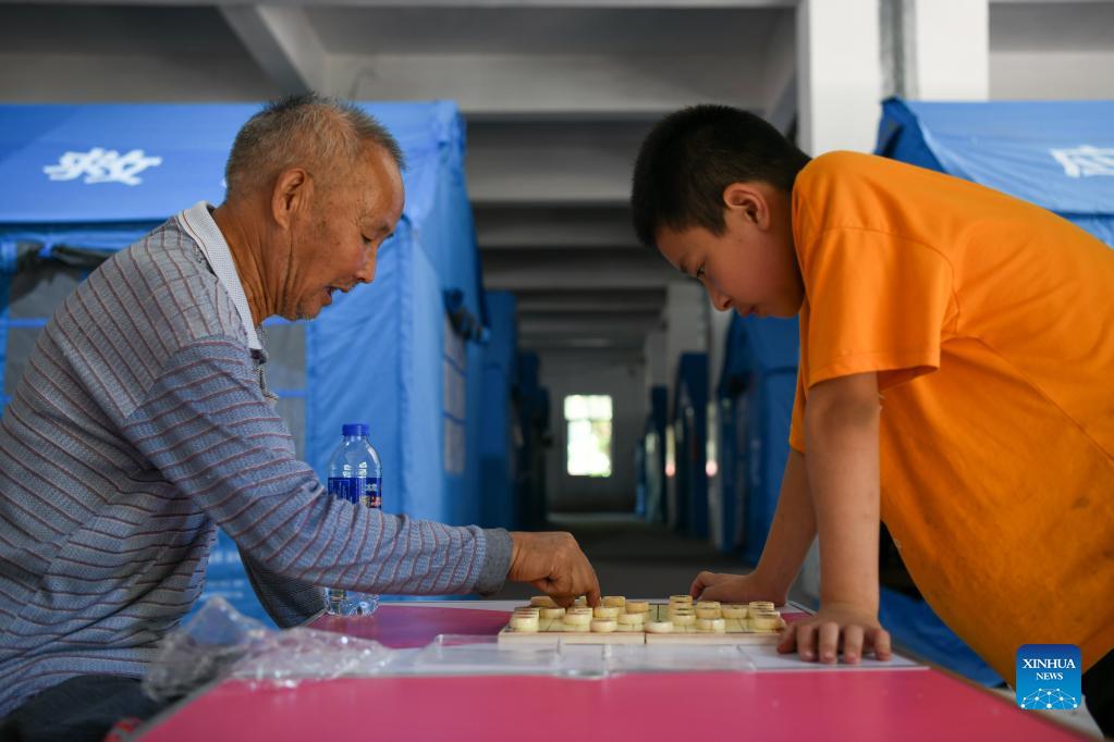An elderly man plays Chinese chess with a child at a temporary resettlement site in Fuji Township of Luxian County, southwest China's Sichuan Province, Sept. 21, 2021. Residents from Sichuan Province who were affected by an earthquake that struck on Sept. 16 began returning home on Monday morning, as the local work priority has been shifted from emergency rescue to post-quake reconstruction. A 6.0-magnitude earthquake jolted Luxian County in the city of Luzhou at 4:33 a.m. on Sept. 16, leaving three people dead and 146 injured. (Xinhua/Xu Bingjie)