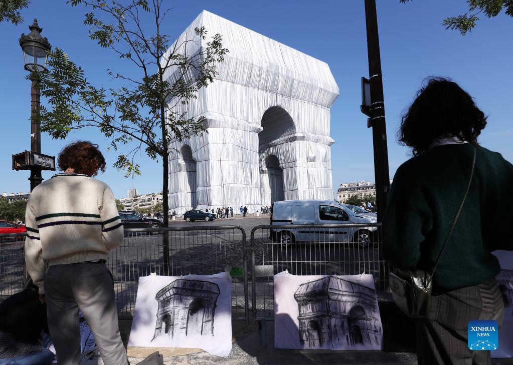 People sketch for the wrapped Arc de Triomphe in Paris, France, Sept. 21, 2021. The entire Arc de Triomphe at the top of the Champs-Elysees in Paris is to stay wrapped in fabric for two weeks, an art installation conceived by the late artist Christo and inaugurated on Thursday by French President Emmanuel Macron. (Xinhua/Gao Jing)