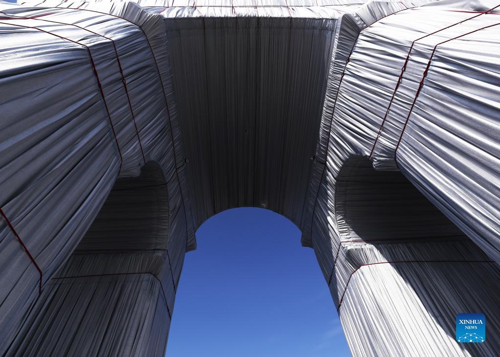 The wrapped Arc de Triomphe is seen in Paris, France, Sept. 21, 2021. The entire Arc de Triomphe at the top of the Champs-Elysees in Paris is to stay wrapped in fabric for two weeks, an art installation conceived by the late artist Christo and inaugurated on Thursday by French President Emmanuel Macron. (Xinhua/Gao Jing)