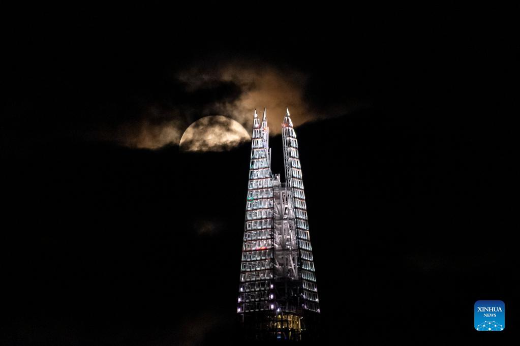 Photo taken on Sept. 21, 2021 shows the full moon rising over the Shard in London, Britain. (Photo by Stephen Chung/Xinhua)