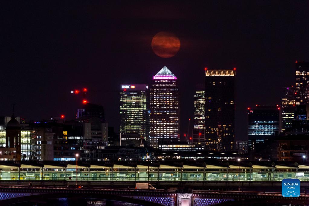 Photo taken on Sept. 21, 2021 shows the full moon rising over Canary Wharf in London, Britain. (Photo by Stephen Chung/Xinhua)