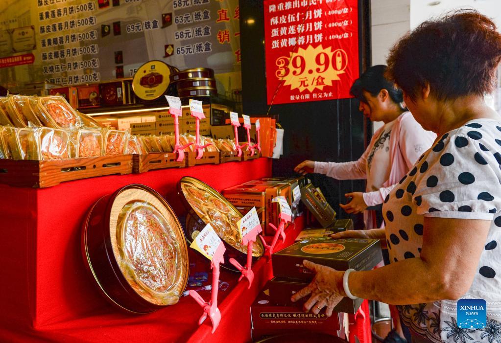 Customers select mooncakes at a Hainan-style mooncake shop in Haikou, capital of south China's Hainan Province, Sept. 19, 2021. Hainan-style mooncake combines the features of crispness and syrup golden crust. It's crispy in crust, rich in taste, sweet but not greasy. (Xinhua/Zhou Jiayi)