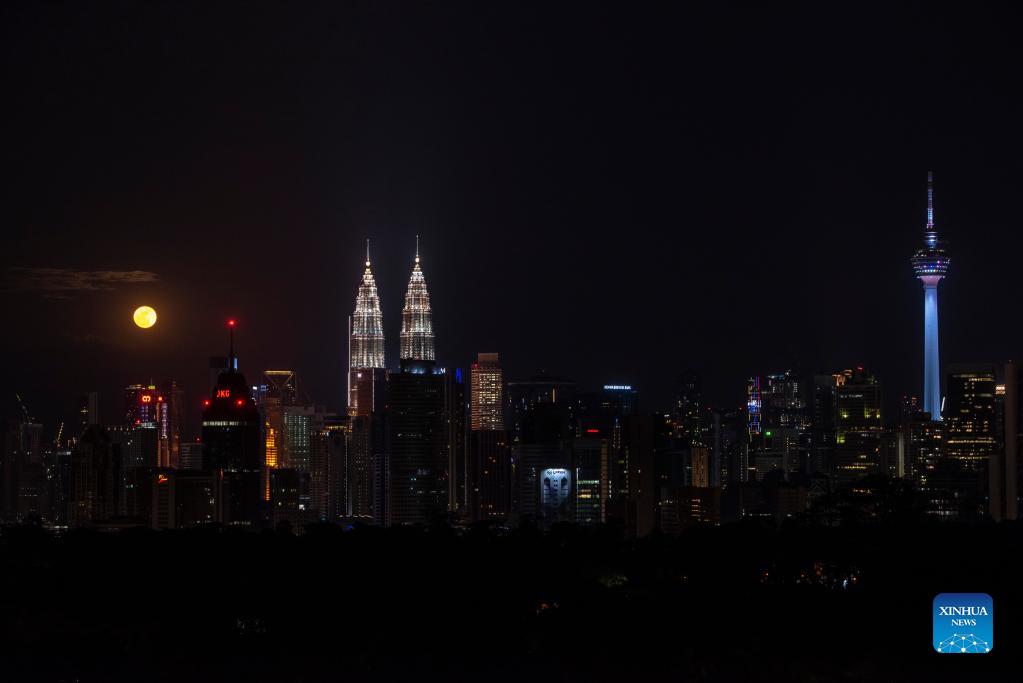 A full moon is seen against the skyline of Kuala Lumpur, Malaysia, on the occasion of Mid-Autumn Festival on Sept. 21, 2021. The Mid-Autumn Festival, which falls on Sept. 21 this year, is a traditional Chinese festival with a custom of family reunion. (Photo by Chong Voon Chung/Xinhua)