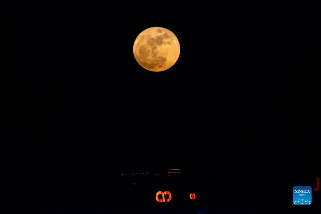 A full moon is seen against the skyline of Kuala Lumpur, Malaysia, on the occasion of Mid-Autumn Festival on Sept. 21, 2021. The Mid-Autumn Festival, which falls on Sept. 21 this year, is a traditional Chinese festival with a custom of family reunion. (Photo by Chong Voon Chung/Xinhua)