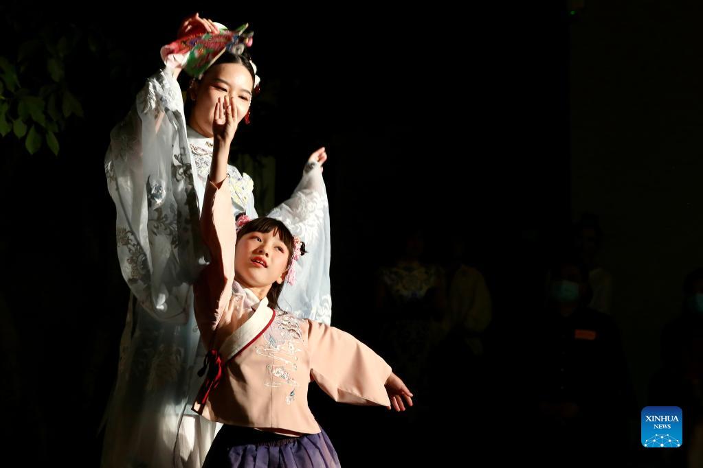 People dressed in traditional Chinese apparel perform during a special event to celebrate Mid-Autumn Festival at the USC Asian Pacific Museum in Pasadena, Los Angeles County, California, the United States, on Sept. 20, 2021. Celebrating the traditional Mid-Autumn Festival, the Sino US Performing Arts Organization held the special event featuring a fashion show and performance event inspired by Hanfu, traditional Chinese apparel, and thousands of years of evolving Chinese fashion. (Xinhua)