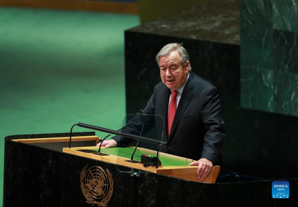 UN Secretary-General Antonio Guterres addresses a high-level meeting to mark the 20th anniversary of the adoption of the Durban Declaration and Programme of Action at the UN headquarters in New York, on Sept. 22, 2021. Guterres on Wednesday called on all member states to take concrete actions, including policy measures, legislation and more granular data collection, to build on the current momentum against racism. (Xinhua/Wang Ying)