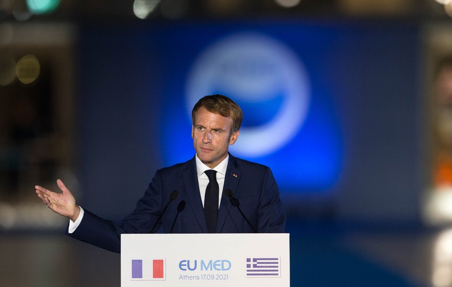 French President Emmanuel Macron addresses the press at the nine Mediterranean European Union member states (EUMED 9) Summit in Athens, Greece, on Sept. 17, 2021. (Xinhua/Marios Lolos)