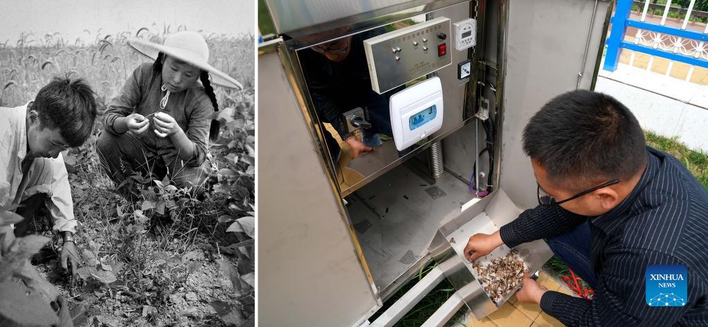 Combo photo shows people checking the damage caused by a locust plague in Runan County in the 1960s (L, photo taken by Zhang Qingyun), and a staff member checking the species and number of insects captured in a bait device near a field in Nanling Village of Shangshui County on April 14, 2021 (photo taken by Li An), in central China's Henan Province. Henan is an important province for agricultural production in China. Since the founding of the People's Republic of China in 1949, especially during the 40-plus years of reform and opening-up, mechanized and hi-tech farming has helped improve the quality and efficiency of agricultural business there. To date, an increasing number of farmers there are embracing advanced agricultural equipment and management process, bidding farewell to traditional arduous means of agricultural operation. (Xinhua)