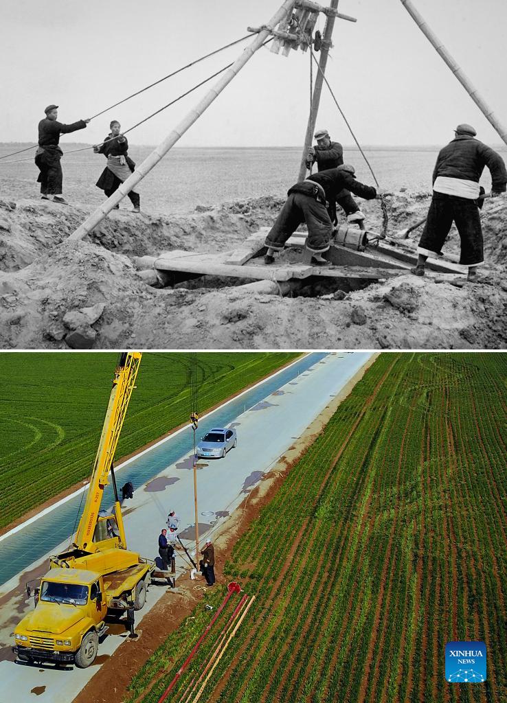 Combo photo shows people drilling a well in Xihua County in the 1950s (top, photo taken by Sun Jing) and staff members installing a pump for irrigation in Wangzhuang Town of Xunxian County on March 9, 2017 (aerial photo taken by Li An), in central China's Henan Province. Henan is an important province for agricultural production in China. Since the founding of the People's Republic of China in 1949, especially during the 40-plus years of reform and opening-up, mechanized and hi-tech farming has helped improve the quality and efficiency of agricultural business there. To date, an increasing number of farmers there are embracing advanced agricultural equipment and management process, bidding farewell to traditional arduous means of agricultural operation. (Xinhua)