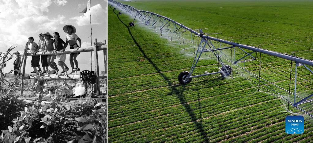 Combo photo shows people pedalling on a waterwheel for irrigation in Yancheng County in the 1950s (L, photo taken by Wei Dezhong), and a self-moving smart irrigator conducting irrigation in fields in Wangzhuang Town of Xunxian County on March 9, 2017 (aerial photo taken by Li An), in central China's Henan Province. Henan is an important province for agricultural production in China. Since the founding of the People's Republic of China in 1949, especially during the 40-plus years of reform and opening-up, mechanized and hi-tech farming has helped improve the quality and efficiency of agricultural business there. To date, an increasing number of farmers there are embracing advanced agricultural equipment and management process, bidding farewell to traditional arduous means of agricultural operation. (Xinhua)
